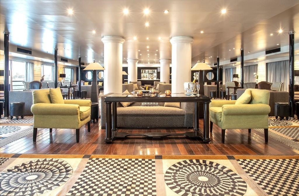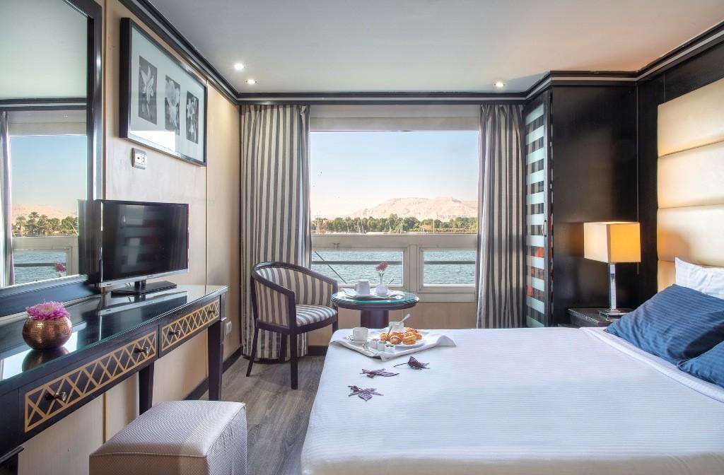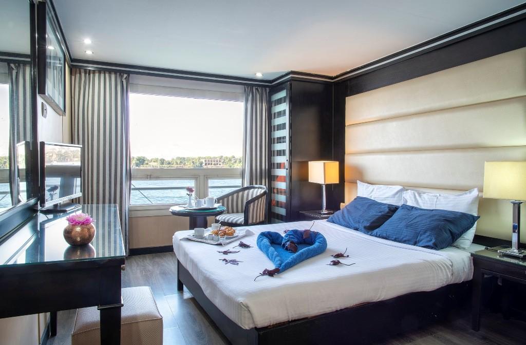 The Kon Tiki Nile Cruise is built for luxury sailing on the Nile and can host up to 150 guests. The ship offers different programs: 3 nights from Aswan, 4 nights from Luxor, and a longer 7-night cruise covering both cities. On board, there are 70 cabins in total, including 64 standard cabins, 4 suites, and 2 panoramic suites. Each cabin combines comfort and style, with elegant décor that creates a warm and relaxing atmosphere.