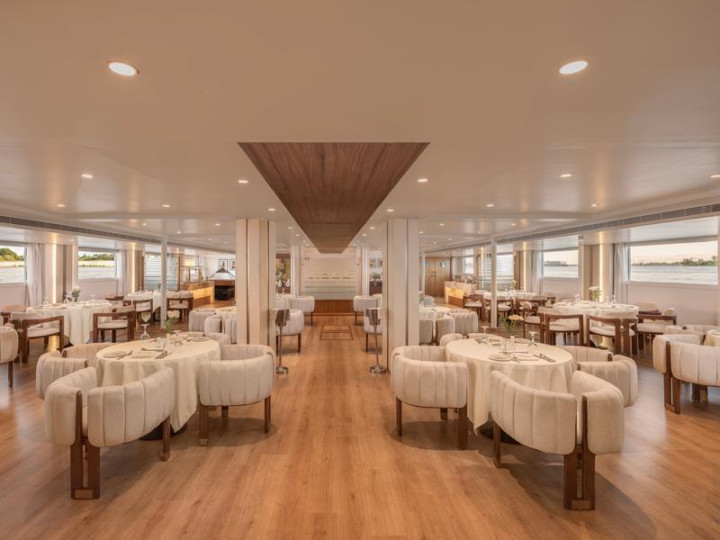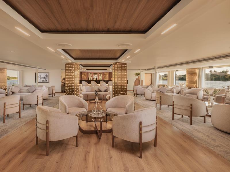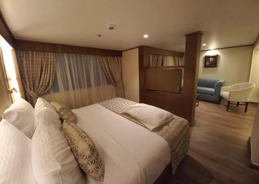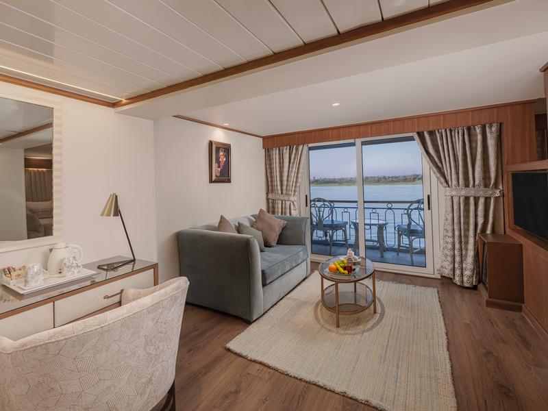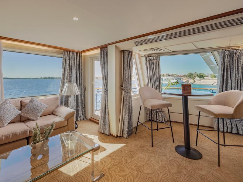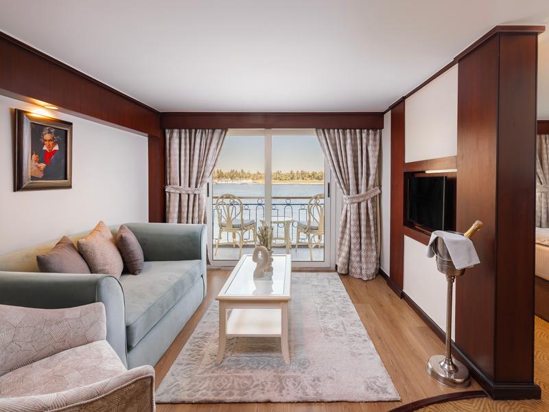 The Sonesta Star Goddess Nile Cruise is a modern luxury ship sailing between Aswan and Luxor. It features 33 spacious suites, each with a private balcony and named after famous composers for a touch of elegance. The ship includes 27 deluxe Beethoven Suites (40m²), 4 Mozart Suites (35m²), and 2 superior Chopin Suites (52m²). All suites are non-smoking, with smoking allowed only in open areas.